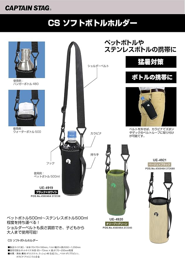 キャプテンスタッグ(CAPTAIN STAG) ペットボトルホルダー ボトルカバー ドリンクホルダー 水筒カバー CS ソフトボトルホルダー 肩掛けショルダーベルト付き 長さ調節可能 カラビナ付き 【ペットボトル500ml~ステンレスボトル500ml程度対応】 ベージュ ブラック UE-4921 ( 3)