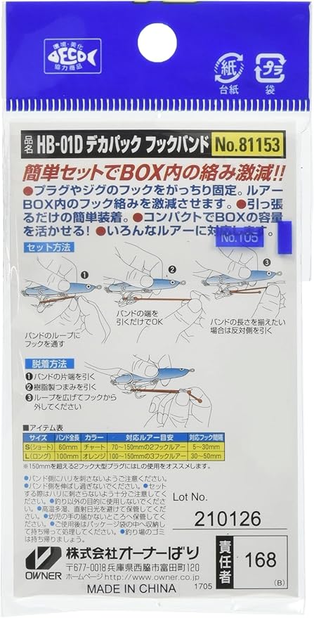 ●HB-01D デカパック フックバンド ◎商品説明 ルアーにセットしたフックの絡みを激減 ケースに入れたルアーを持ち歩く際、悩みの種がルアー同士のフック絡み。素早いルアーローテーションができないばかりか、絡みを解いている間にルアーを落としてしまうこともしばしば。 そんな悩みを解決するのがこのフックバンド。 2フックはもちろん、3フックのルアーにも対応し、フックをバンドで固定するだけで、フック絡みを大幅に減少。セットしやすく、外しやすい特殊グリップ搭載で、瞬間着脱もOK。 便利過ぎて、一度使えば止められません。 使用後にはワームなどには接触しないようにご注意ください。 ◆仕様詳細 品 番:81153(81153) 形 態:小物アクセサリー