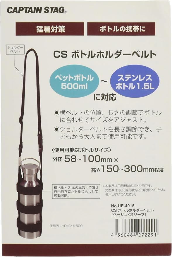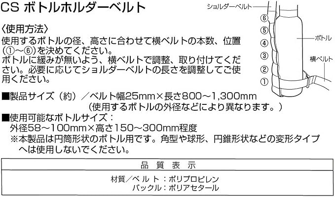 製品サイズ:(約)ベルト幅25mm 長さ800~1300mm(使用するボトルの外径などにより異なります。)、使用可能なボトルサイズ:(約)外径58~100mm 高さ150~300mm程度