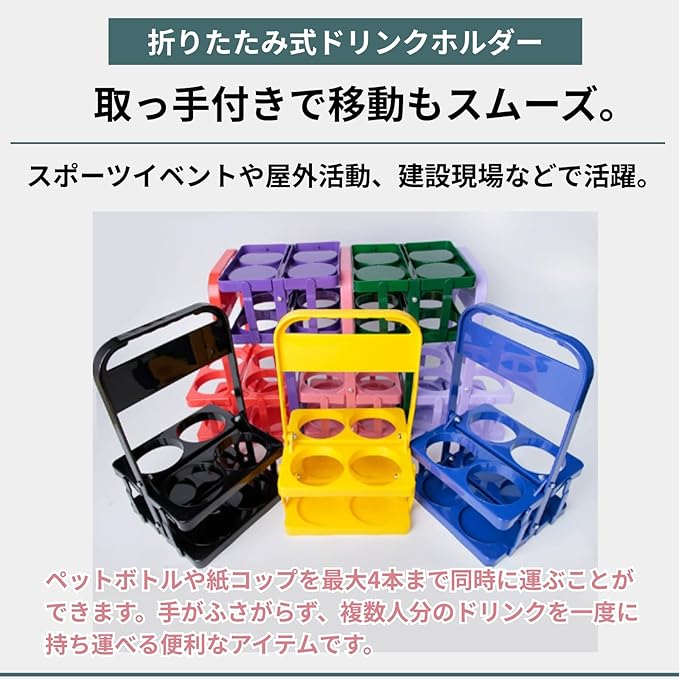 【持ち運びに便利なドリンクホルダー】 スポーツイベントや屋外活動、建設現場などで活躍する多機能ドリンクホルダー。ペットボトルや紙コップを最大4本まで同時に運ぶことができ、取っ手付きで移動もスムーズ。手がふさがらず、複数人分のドリンクを一度に持ち運べる便利なアイテムです。