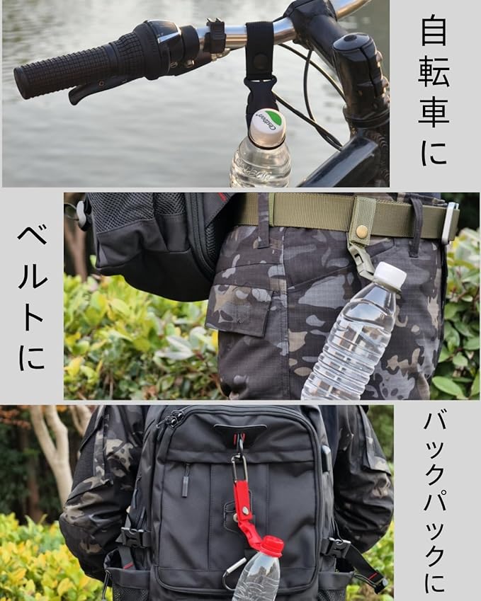 【モバイル水分補給ソリューション】** ・ハイキング中にバックパック外側でクイックアクセス。 ・サイクリング時にフレームにセットして振動防止。 ・キャンプサイトでテントポールに吊り下げ即席給水ステーションに。