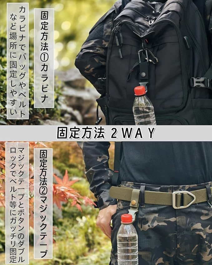 【プロの二種固定方法】**固定方法はプロの2WAYあります。 ▼カラビナクリップ:バッグ/ギアベルトへの瞬時アタッチ。 ▼強化型マジックテープ+ボタンロック:激しい動きでもゼロシェイク。サバゲー/岩登りなど過酷な環境下でもボトルを確実ホールドします。