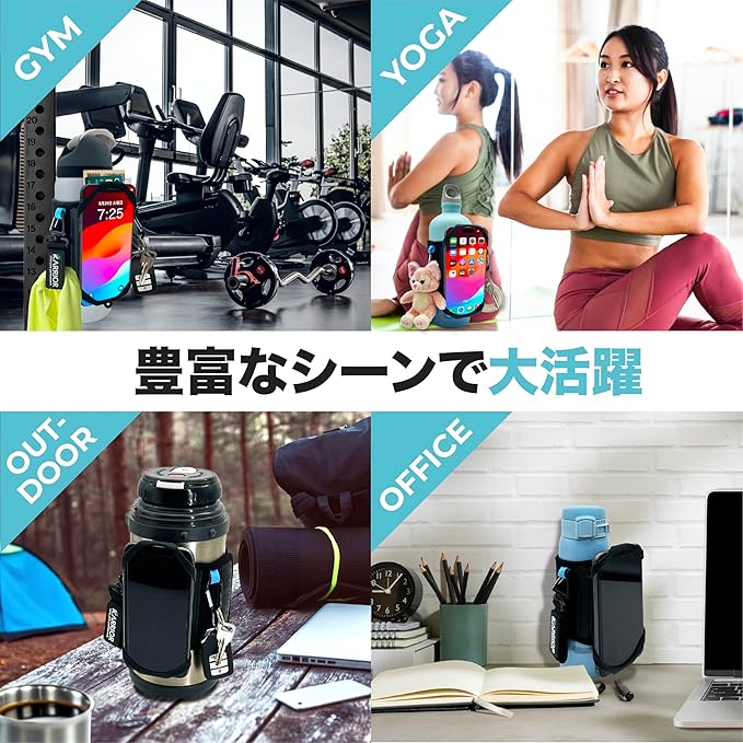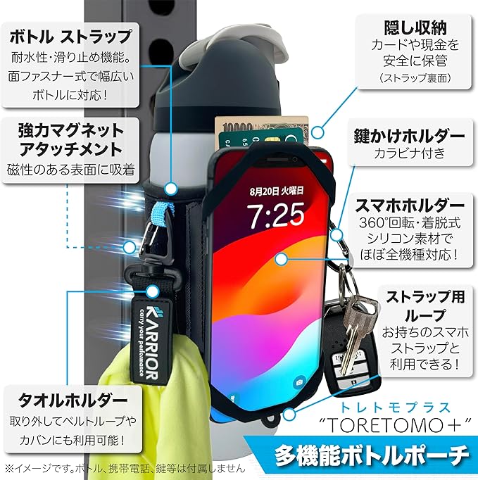 【概要】KARRIOR(キャリアー)ボトルポーチはお気に入りのボトルに巻くだけで、必需品を一つにまとめられるジムトレーニングに最適なアイテムです。 お持ちのボトルが360 回転する着脱式スマホホルダー、タオルホルダー、鍵ホルダー、そしてカードや現金を収納できる隠しポケットなどの多機能ポーチへと大変身します。さらに、4つの強力なマグネットを備えており、ジムマシンなどの金属製の表面に簡単に取り付けられます。これにより、大切な荷物を床に置く必要がなく、必需品を手の届く場所に安全に保管できます。※ボトル・水筒などは付属しません。