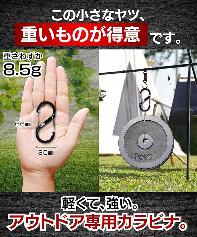 【軽量設計で日常にも最適】1個あたりわずか8.5gという軽さで、持ち歩きやすく日常のバッグや鍵、ベルトにも自然にフィット。アウトドアシーンだけでなく、通勤や通学時の小物整理にも活躍します。