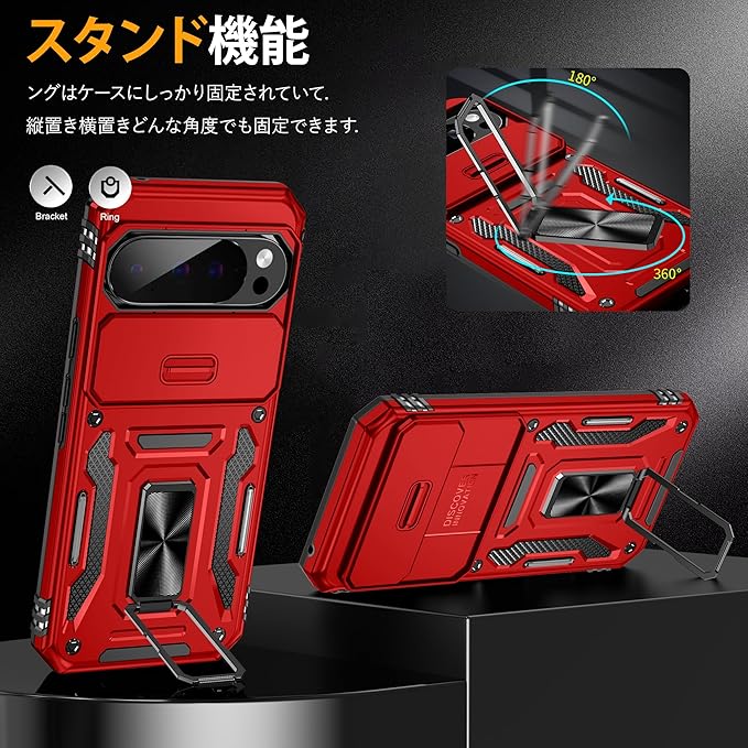 YULNCUZ Google Pixel 10 Pro XL 対応 ケース リング付き スライド式カメラカバー 耐衝撃 スタンド機能 車載ホルダー レンズ保護 ピクセル10 プロ xl 対応 スマホケース PC TPUバンパー 防塵 人気 落下防止 滑り止め 指紋防止 携帯カバー 赤 K358