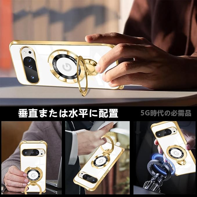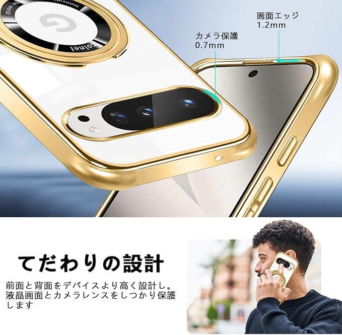 Google Pixel10 Pro XL ケース クリア ショルダー 透明 グーグルピクセル10 pro xl カバー リング付き pixel 10 pro xl カバー スタンド機能 マグネット搭載 耐衝撃 米軍規格 紐付き 斜めがけ 織りストラップ付き ネックストラップ ショルダー 縦/横 2WAY 長さ調整可能 取り外し可能 落下防止 紛失防止(ゴールド)