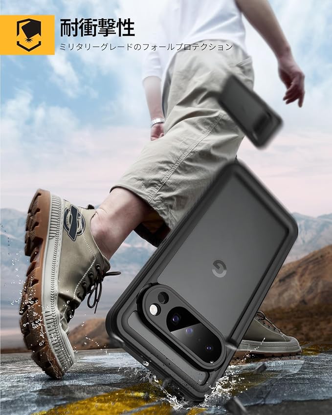 【強防衝撃力・360 保護】軍用MIL規格810G-516防振材料が採用されていますので、衝撃にとても強いです。ピクセル 10 プロ防水ケースの嵌め込み式前カバーと透明バックカバーの組み合わせにより、360 全方位からPixel 10 Proを保護してくれます。落下、衝撃、擦れ傷など一切心配ありません。粉塵も中に入らない、砂や埃が舞う過酷な環境でも端末をしっかり包んで保護します。