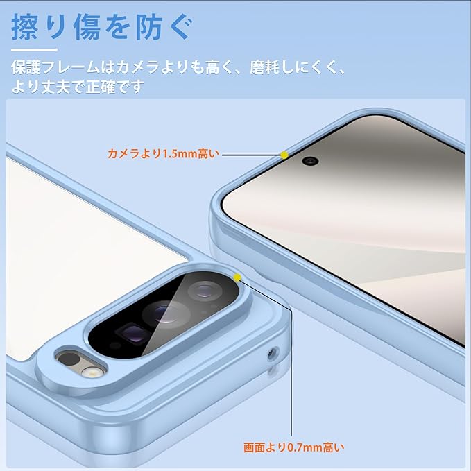 「黄ばみ防止」ケースの側面は単色のTPU素材で作られており、耐久性があり、色が変化したり変形したりしにくいです。背面パネルは、酸化防止加工を施した透明PC素材を採用。黄ばみを防ぎ、長期間使用しても透明感を保ちます。表面には疎油性コーティングが施されており、指紋や油汚れ、汗染みがつきにくく、爽やかな手触りです。