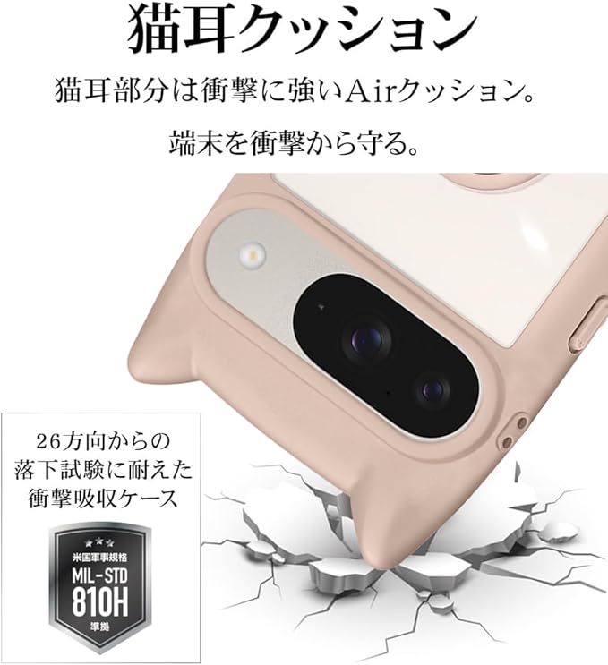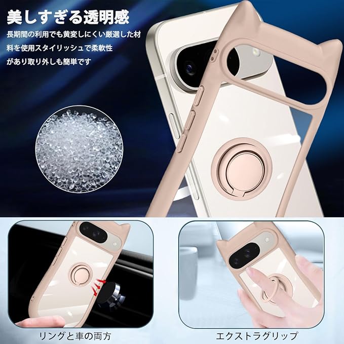 Google Pixel 9/9 Pro 用 ケース クリア カバー 猫耳 リング付き リングホルダ かわいい おしゃれ スタンド付き ストラップホール ピクセル9/9プロ スマホケース 多機能 全面保護 落下防止(ピンク)