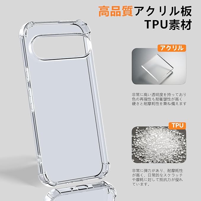 【衝撃吸収】 ゴムやシリコンのように柔らかいTPU素材使用!!本体に完全フィットし、全体を包み込むデザイン。保護ケースの四隅にエアショックパッドを設置して、スマートフォンが落下などの衝撃を吸収し、大切なGoogle Pixel 9 Pro XLを守ります