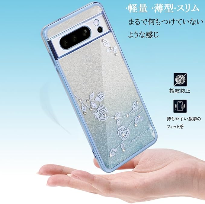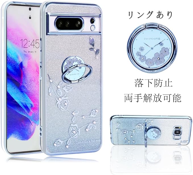 JOOBOY スマホケース 対応 Google Pixel 8Pro 用 ケース リング付き クリア キラキラ メッキ加工 花柄 ソフトケース TPU 薄型 おしゃれ かわいい 衝撃吸収 ブランド グーグル ピクセル 8プロ カバー (ブルー)
