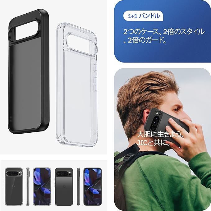 JIC 2-in-1 バンドル: Pixel 9およびPixel 9 Pro用 - クリスタルクリアケース1個とブラックトランスルーセントケース1個 - 2つのケースで、スタイル倍増、保護力倍増