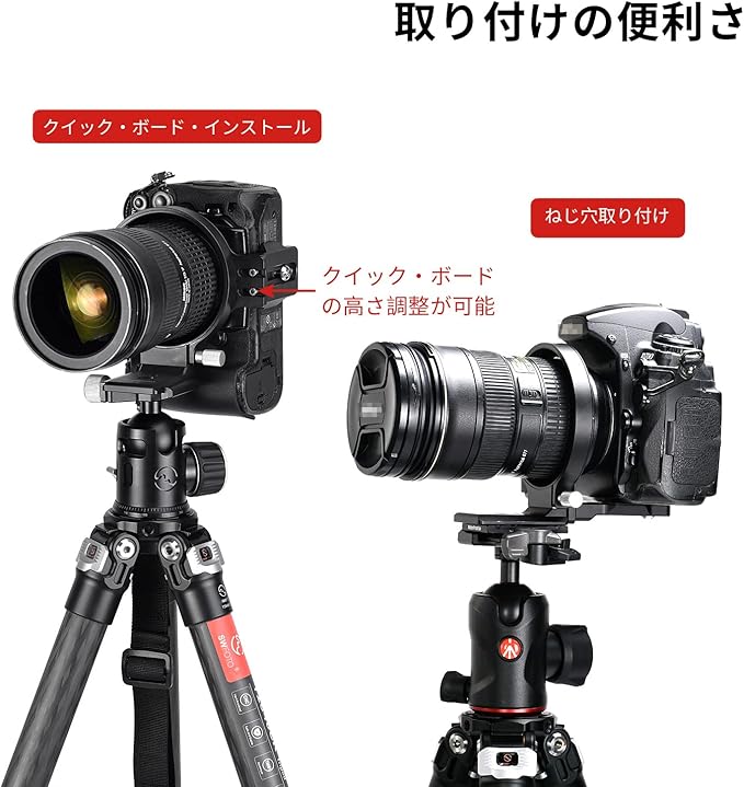 横と縦を自由に切り替えられ:ロックネジを緩めてカードポイントまで本体を回し、ネジをロック。カメラを雲台から取り外して設置しますことなく、横撮りと縦撮りを素早く切り替えることができますようにします。