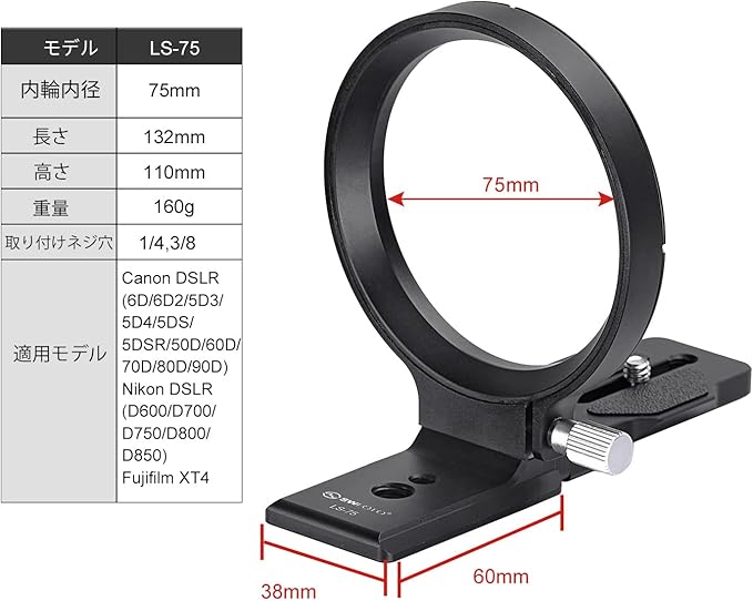 多種類のカメラの汎用性:内輪内径75mm、ボディボード内設計ネジシュート、内輪ボディクイックマウントボードも設計マウントシュート、レンズリングの汎用性をさらに良くしますことができてキヤノン5DIV、5DIII、ニコンD850、D810、D750、FUXXT4などの型番。