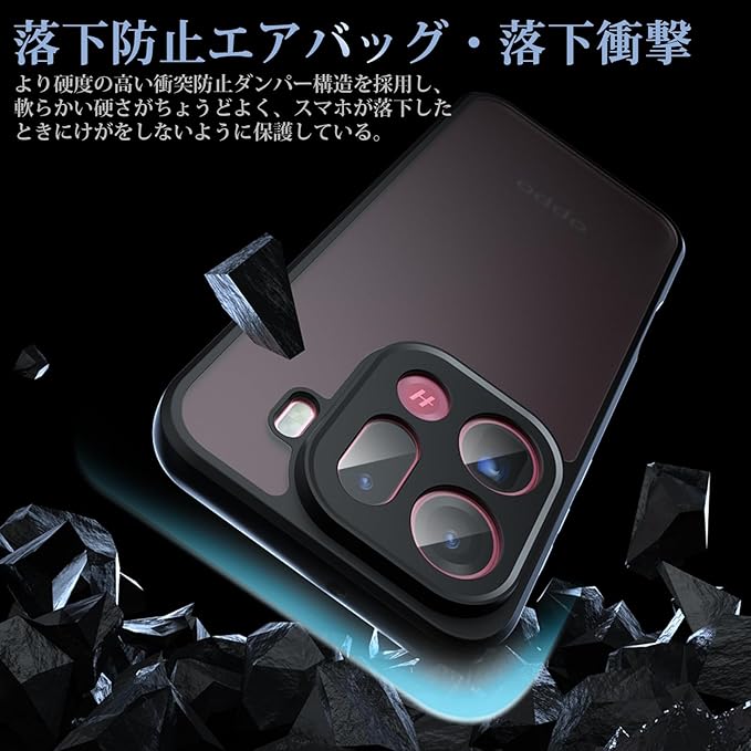 【レンズとスクリーン保護】ケースの厚さは本体より若干高く、oppo find x9 proが机などの平面の物の上に置いても傷がつかない。スマホが落下した際に液晶画面やレンズに傷が付かないようにする。