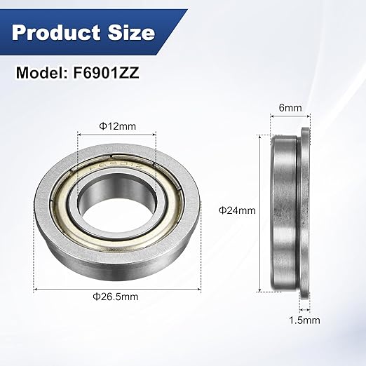 [サイズ&パッケージ] - 4個 x 交換用ホイールベアリング; タイプ:F6901ZZ; サイズ:12 x 24 x 6 mm(内径 x 外径 x 幅); フランジサイズ:26.5 x 1.5 mm(外径 x 厚さ)。高精度のPO(A BEC1)と低摩擦設計により、高速アプリケーションに適しています
