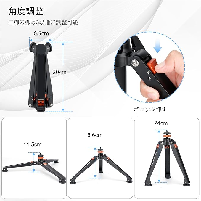 安定したサポート - 三脚ベースは高強度アルミニウム合金製で耐久性に優れています。脚の長さは21cmで、延長された三脚脚により安定性が向上しています。耐荷重10kg(最低伸長位置)