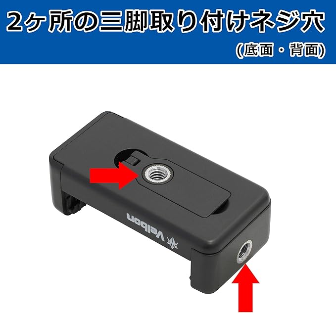 ホルダーの背面と底面に三脚取付ネジを装備、縦位置撮影・横位置撮影のどちらにも対応します。