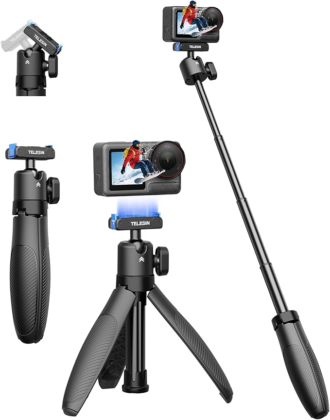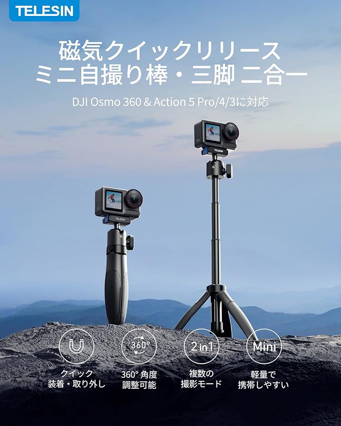 TELESIN DJI Osmo Action 5 Pro/4/3用 ミニ延長ロッド 三脚マウント 磁気クイックリリース 360 回転 縦撮り対応 40cm自撮り棒 一脚 卓上三脚 軽量 セルカ棒 折りたたみ 4段伸縮 vlog撮影 小型で持ち運びに便利 DJI Osmo 360/Action 5 Pro/4/3アクセサリーに対応