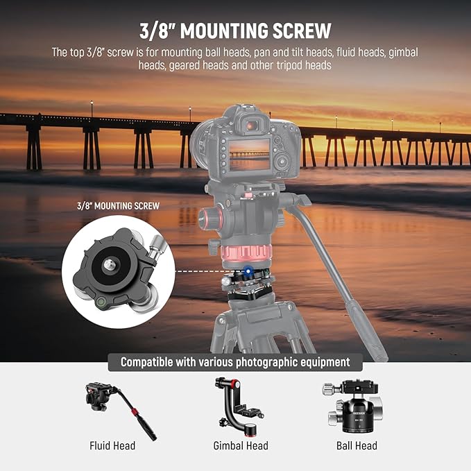 【幅広い互換性3/8"ネジ】上部の3/8"ネジは、ボール雲台、パン/ティルト雲台、フルード雲台、ジンバル雲台、ギア雲台、その他の三脚雲台を取り付けることができ、汎用DSLRカメラと互換性があります。滑り止めゴムパッドは安定性を高め、機材の傷を防ぎます。