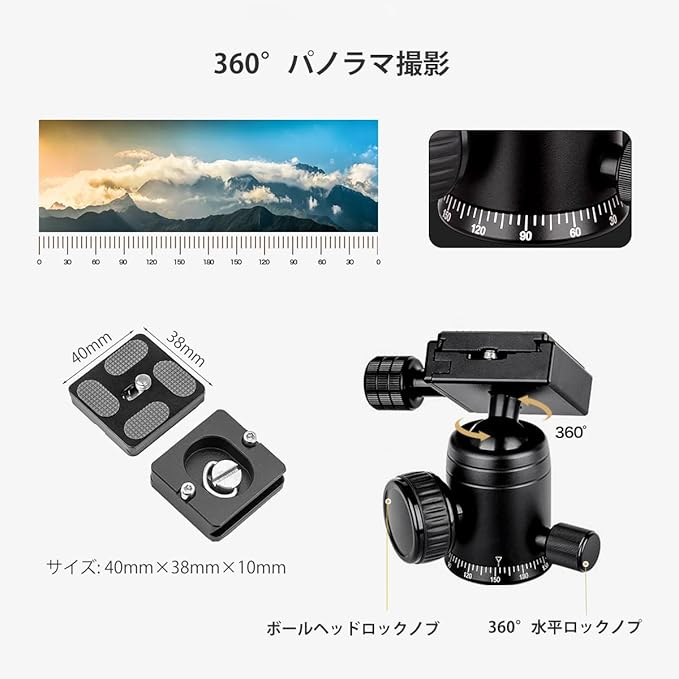 すべてのSLRカメラに適した1/4 "ネジクイックリリースプレート付き360度スピンボールヘッド。3/ 8"ネジ付き三脚。一脚または自撮り棒と接続して多目的に使用できます。