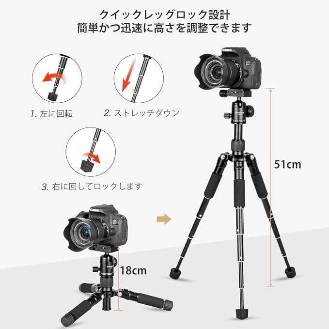 三脚は、高強度アルミニウム合金のフットチューブとクイックレッグロック設計、高度なCNC処理技術で作られています。 強くて安定しています。 5kgまでの負荷。