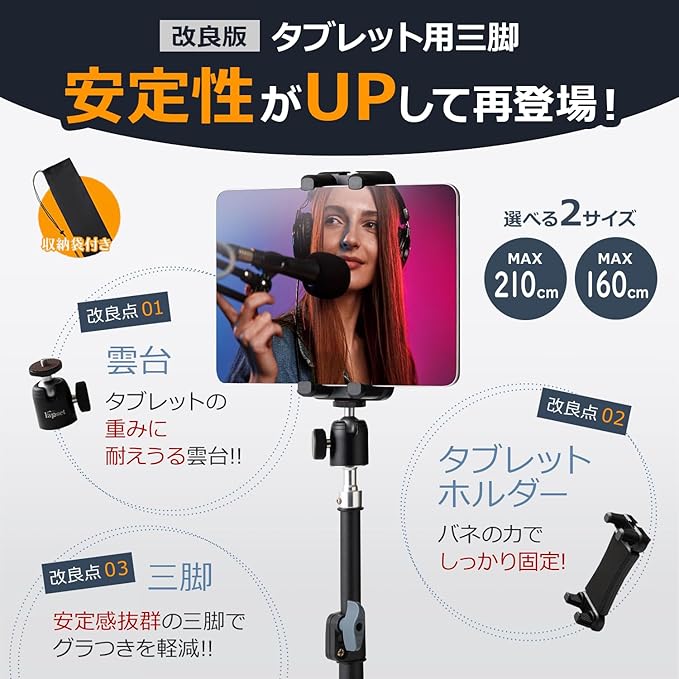 lapset 【とにかく安定】タブレット三脚 タブレットスタンド 三脚スタンド ipad 2サイズ 160cm