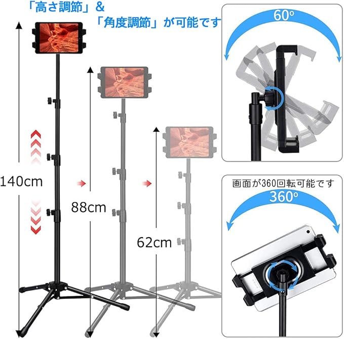 【高さ調整可能】高さは62cm~140cm調節できるので、パソコンで作業しながら、目線の高さにスマホを固定したいときにも便利です。3段式のパイプは可変できる箇所が複数あるので、高さが自由に調整できます