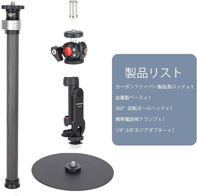セット内容:ST-2070カーボンファイバー延長ロッド 1、ラウンドベース 1、ボールヘッド 1、携帯電話ホルダー 1、変換ネジ(1/4"から3/8") 1。ご質問等ございましたら、24時間以内にいつでもカスタマーサービスまでご連絡ください。