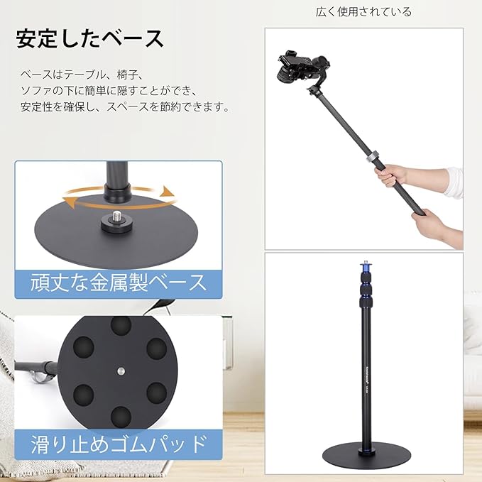 この丸型ベース伸縮式スタンドは、デスクトップ、オフィス、スタジオなど、平らで頑丈な場所であればどこでも使用できます。かさばるスタンドや三脚に代わる、カメラ、マイク、ライト、モニターを支えるための、ワンストップで転倒防止、そしてスタイリッシュな代替品です。