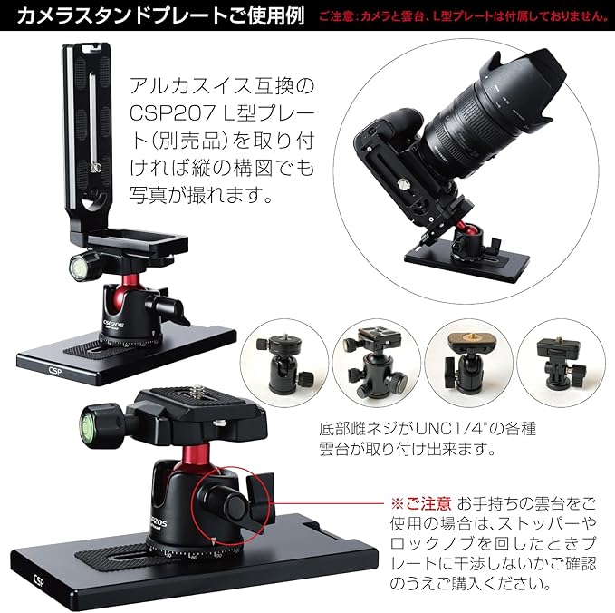 【注意事項】①三脚禁止の場所でも使用できますが、固定器具禁止の場所もありますので、現場の撮影ルールをお守りください。②不安定な場所では、しっかりと設置されていることを確認し、必ずカメラストラップを身につけてご使用ください。③マウントネジ部分の耐荷重は15kg以上ありますが、この商品は2kgまでの機材を載せるように作られていますので、これ以上の重さの機材は載せないでください。④カメラスタンドプレート(CSP201)は、CSP205の低重心自由雲台をお勧めいたしますが、お手持ちの雲台をお使いの場合は、ストッパーやロックノブがプレートに干渉しないかご確認のうえご購入ください。⑤三脚のように上下に可動はいたしません。テーブルなどを利用して高さ調節してください。⑥本来の目的以外の用途に使用しないでください。