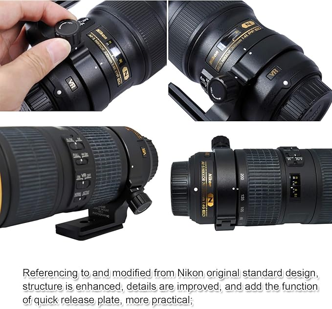 このレンズブラケットはニコン Nikon AF-S NIKKOR 300mm f/4E PF ED VR Lens と Nikon AF-S NIKKOR 70-200mm f/4G ED VR レンズのために特別に設計。他のレンズとの併用はできませんので、使用範囲外のレンズは購入しないでください。