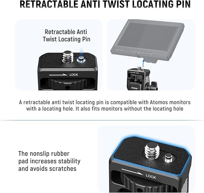 【格納式ねじれ防止位置決めピン】格納式ねじれ防止位置決めピンは、コンパチブル Atomos Ninja V Ninja V+、位置決め穴付きモニター、または位置決め穴なしNEEWER F100 F200 F400 Pro F500モニターに対応します。滑り止めゴムパッドが安定性を高め、傷を防ぎます。