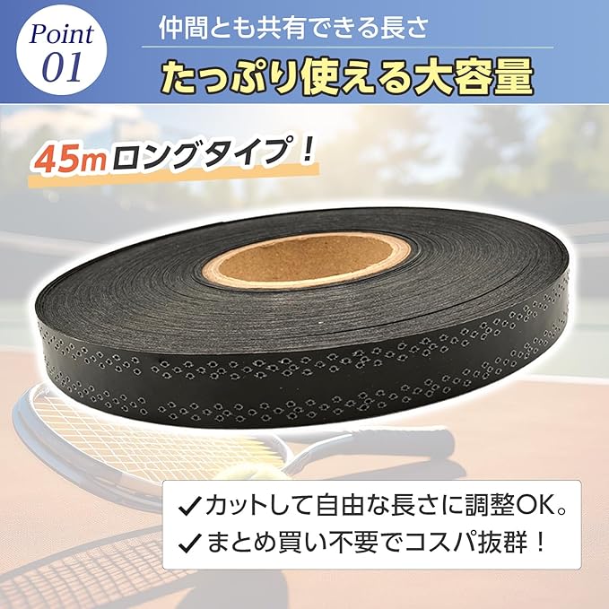 【ラケットなら約40回分!長く使える45mの大容量ロールタイプ】1ロールで約45mの大容量設計。1本のラケットなら約40回分巻けるため、頻繁な交換が不要です。部活動やクラブチーム、家族での共有にも最適。必要な分だけカットして使えるので無駄がなく、コスパ抜群。エンドテープ付きでしっかり固定できます。