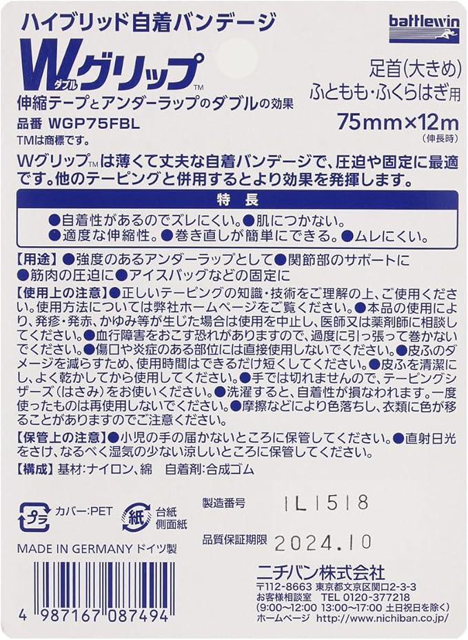 プロサッカー選手 長谷部誠選手 愛用 バトルウィン Wグリップ 青 75mm 12m 足首(大きめ)・ふともも・ふくらはぎ用 テーピング