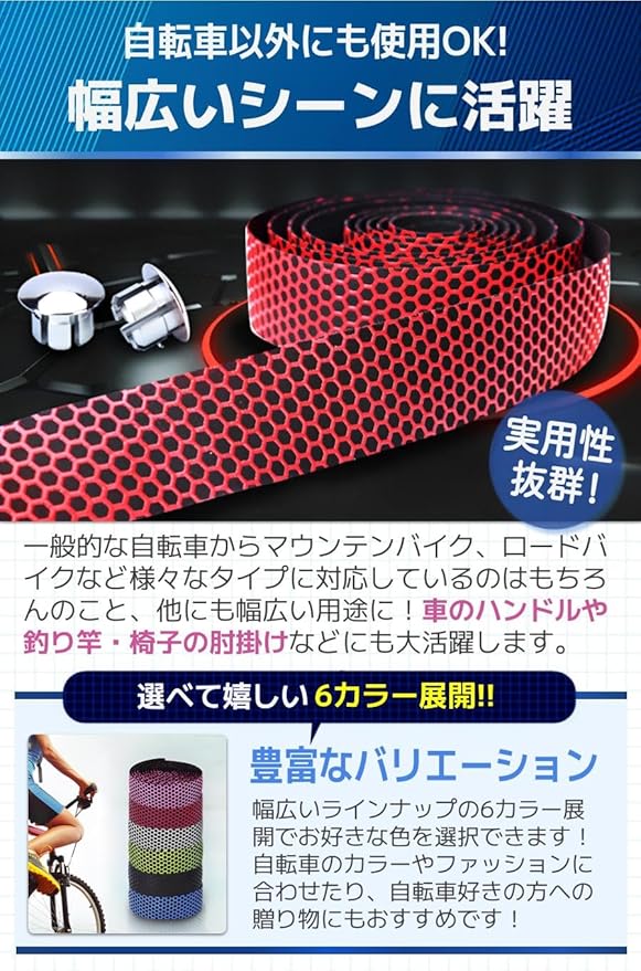 【商品特徴】①取り付け方法簡単!:裏面がシールなので工具不要で使用可能/②快適な握り心地:滑り止め効果により抜群のグリップ力/③汎用性抜群のテープ:自転車・釣り竿・椅子の肘掛けなど多用途/④嬉しい付属品付き:エンドキャップとエンドテープ付き!