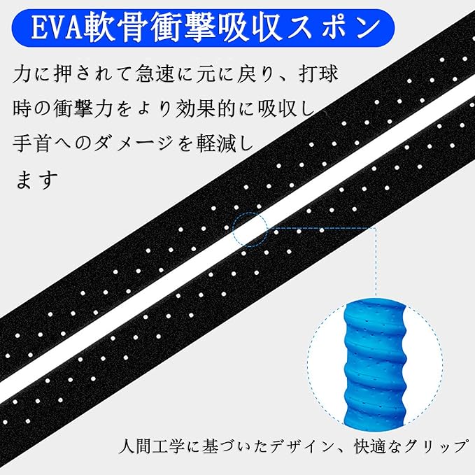 【滑り止め】グリップの表面は凹凸型で、衝撃を軽減します。汗を効果的に吸収できる小さな穴がたくさんあるグリップテープ、滑り止めとしても機能します。