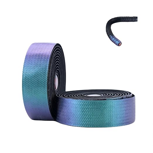 自転車用バーテープ仕様: サイズ:220x3CM カラー:シアンパープル セット内容:バーテープ2本 エンドキャップ 2個 エンドテープ 2枚 EVAとPU素材: 弾力性に優れたEVA素材と地面からの衝撃を押さえるクッション性の高い厚手のPU素材を使用し、雨や汗をかいても握りやすくしっかりしたグリップ感があります。