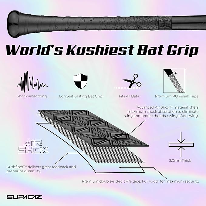 Supacaz (スパカズ) エアショックス ブラック ベースボール バットテープ - ソフトボール バットラップ - ハイパフォーマンス プロ ビッグリーグ バットグリップ - 2mm