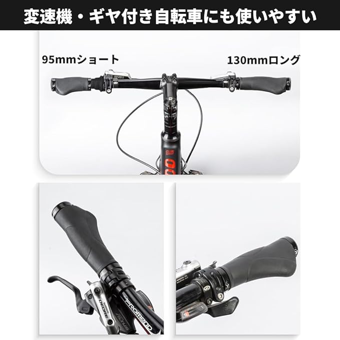 優れた滑り止め効果、長時間のライドでも疲れにくい快適な握り心地、そして耐久性です。特に、手のひらへの圧力を分散させる人間工学設計、安全で快適な走行をサポートします。130mmロング 95mmショートと95mmショート 95mmショートの組み合わせで変速機・ギヤ付き自転車にも使いやすいです。