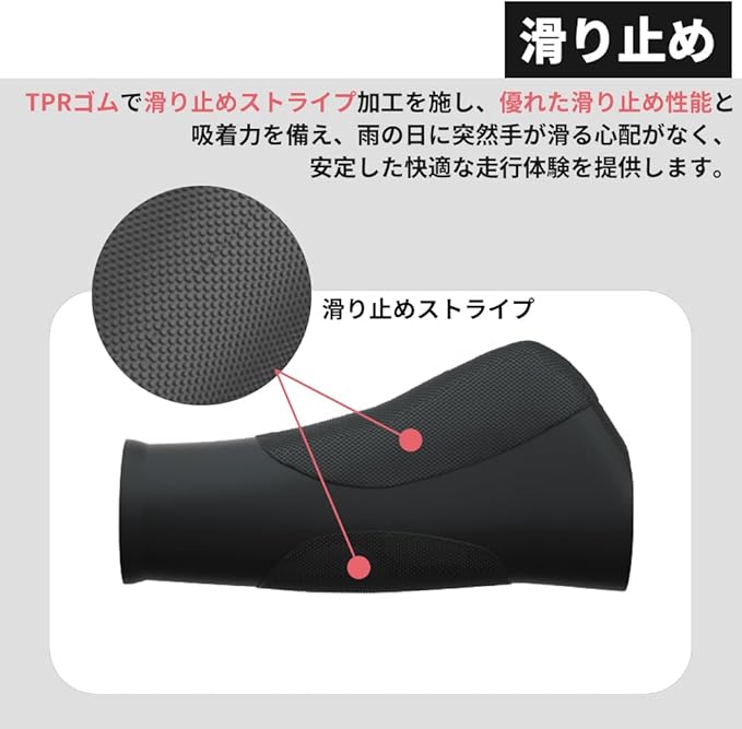 【滑り止め】厚さTPRゴムで作られたハンドルバーは、衝撃や振動から手を保護し、長時間のライディングでの手の疲労を和らげます。 滑り止めストライプ加工を施し、優れた滑り止め性能と吸着力を備え、雨の日に突然手が滑る心配がなく、安定した快適な走行体験を提供します。