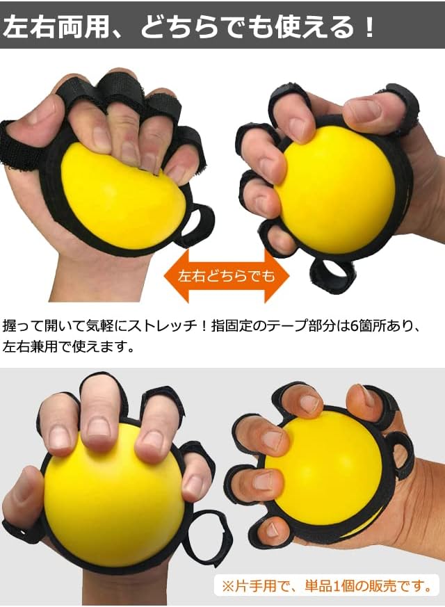 丸い形状と、適度な弾力性、ソフトな感触、すべすべの手触りが気持ち良く、癒されます!ハンドグリップ初心者の方にも使いやすく、普段のストレス解消にも◎目立つ蛍光カラーで視認性が高く、暗いところに置いたりカバンに入れても探しやすいので安心。カラーセラピー効果として明るい気分にも♪握って開いて気軽にストレッチ!指固定のテープ部分は6箇所あり、左右兼用で使えます。軽量で持ち運びしやすいサイズ感ですので、おうちでテレビや新聞を見ながらや、就寝前、学校・オフィスでの休憩中、お出かけ時の移動中、待ち時間など、気楽に隙間時間を使って「ながら運動」できます。オフィスワーカーなど、普段PCの入力作業などで手指が凝り固まってしまっている方、日常、スマホの使いすぎで疲れを感じている方のリフレッシュにも効果的。※片手用で、単品1個の販売です。