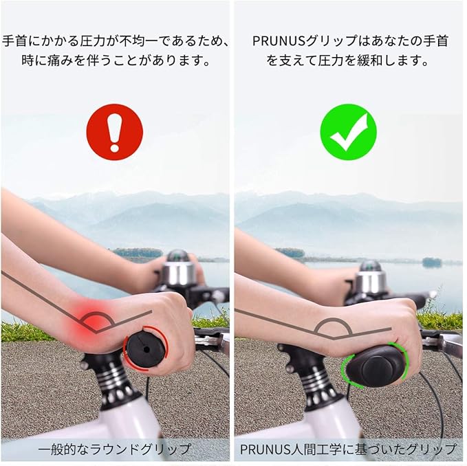 注意:①PRUNUSの自転車用ハンドルグリップは、人間工学に基づいており、一般的な径のハンドルバー(直径22.2mm)であれば、どのハンドバールにも適合します。②ハンドルバーにせっけんを若干塗ることで、グリップを取り付けやすくなります。