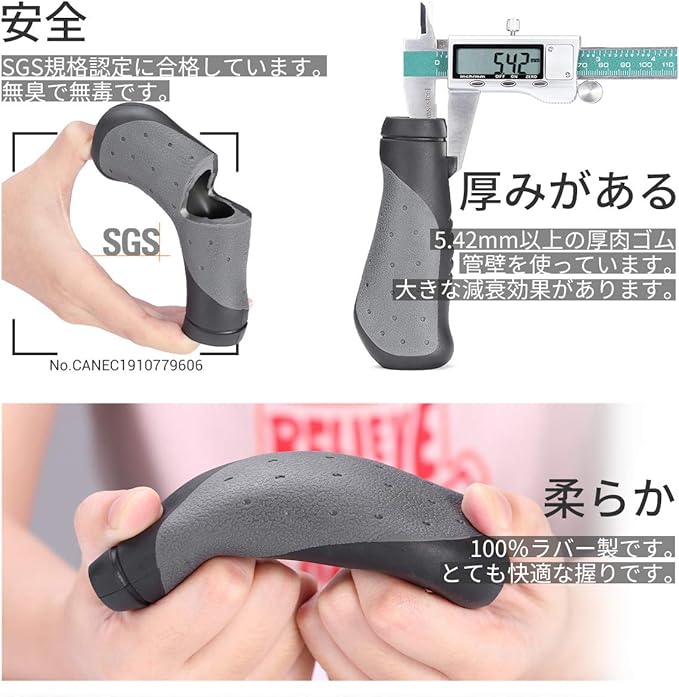吸震の能力が強く、長い距離のサイクリングでも、手が痛くなりません。プラスチックではなく、TPR天然ゴムが素材ですので、汗や雨に濡れても、滑り落ちることはありません。