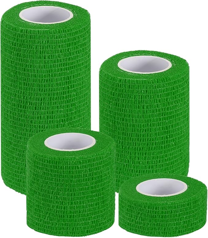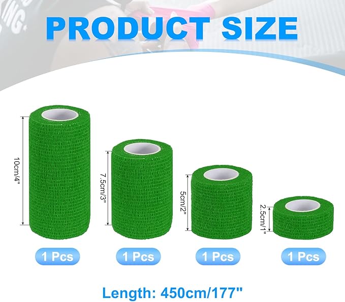 カラー:エメラルド緑;素材:不織布;長さ:177"(450 cm);4つの幅:1"(2.5 cm)、2"(5 cm)、3"(7.5 cm)、4"(10 cm);梱包リスト:セルフアドヘーシブバンデージラップ4個(仕様ごとに1個)