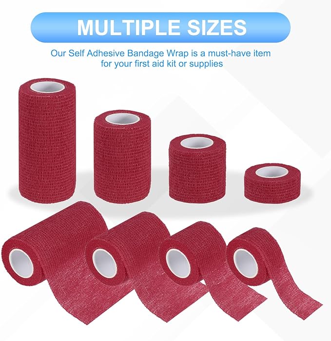 カラー:ダークレッド;素材:不織布;長さ:177"(450 cm);4つの幅:1"(2.5 cm)、2"(5 cm)、3"(7.5 cm)、4"(10 cm);梱包リスト:16個 x セルフアドヘーシブバンデージラップ(1個ごとの仕様)