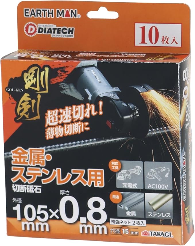 高儀(Takagi) EARTH MAN 剛剣 切断砥石 金属・ステンレス用 105mm 0.8mm 10枚入 穴径15mm 超速切れ 薄物切断 ディスクグラインダー対応 たかぎ TAKAGI