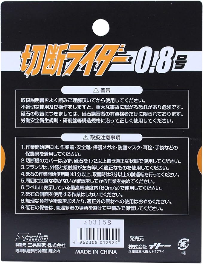 ・切断機のカバーは必ず砥石を1/2以上覆う適正な状態で使用してください。フランジは、外径と接触幅が左右等しく適正な物を使用してください。砥石の作業開始使用時は1分以上、取り換えは3分以上の試運転を行ってください。最高周速度内で使用してください。