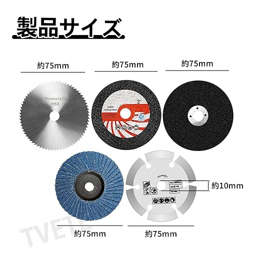 【セット内容】:セットには3インチのアングルグラインダー鋸刃が5枚含まれています。鋸刃の直径は約75MM、内輪の直径は約10MMです。鋸刃はダブルメッシュ樹脂切刃、プラスチック木工切刃、ルーバーホイール、石切刃、研磨刃の計5枚です。イラストに従って適切な鋸刃をお選びください。