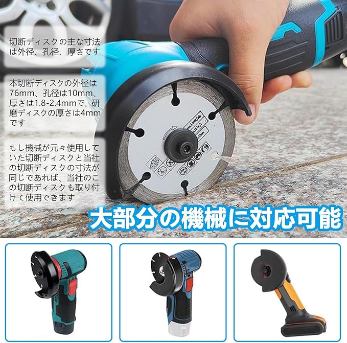 【セット内容】:5枚組の3インチ(約76mm)アングルグラインダー用カットオフホイールセット。内径10mm、厚さ1.8–2.4mm(研磨ディスクは4mm)。金属、木材、タイル、プラスチックなど様々な素材に対応。イラスト付きで用途別に使い分け可能。
